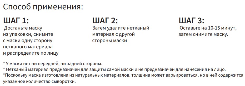 Способ использования: маска состоит из 3 слоев, поэтому снимите 1 слой, чтобы маска плотно прилегала к лицу, затем снимите внешний лист, разгладьте складки и прикрепите маску к коже. Снимите маску через 5–10 минут, дайте остаткам жидкости впитаться в кожу, а затем продолжайте обычный уход.