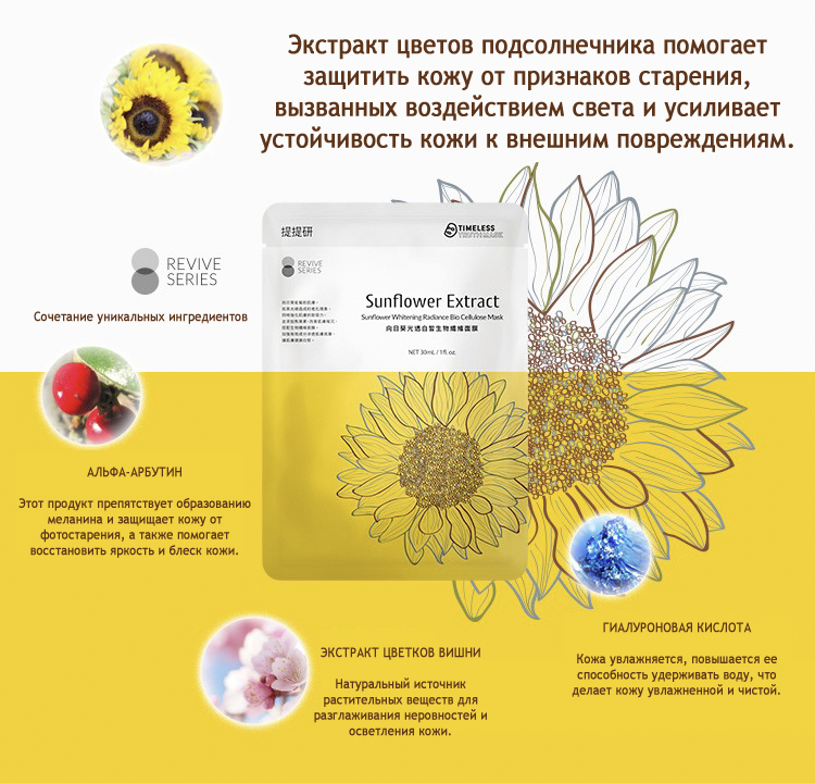 Антивозрастная тканевая маска с экстрактом подсолнуха на основе биоцеллюлозы Timeless Sunflower Extract