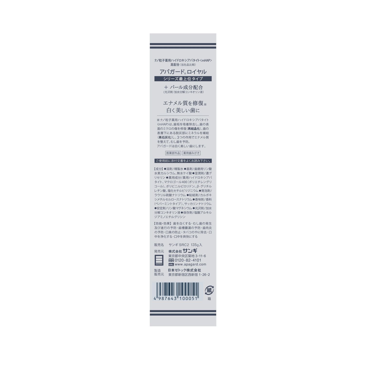 Отбеливающая зубная паста Apagard Royal, из всей серии паст Apagard, содержит самую высокую концентрацию нано-гидроксипатита – это высококачественный продукт для ухода за полостью рта, который представляет собой результат многолетних исследований и разработок компании Sangi. Эта зубная паста содержит уникальный компонент – медицинский гидроксиапатит (mHAP), который является ключевым активным веществом в составе продукта и обеспечивает его высокую эффективность.