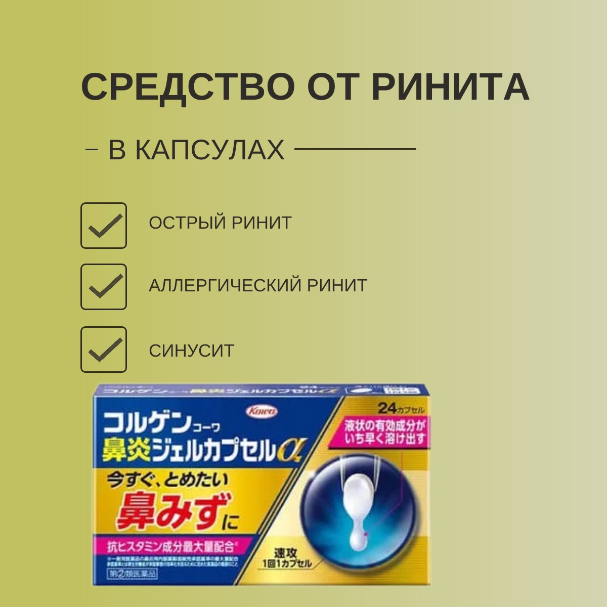 - Основным преимуществом капсул "Kowa Gel Capsule Rhinitis α" является их уникальная жидкая форма, благодаря которой активные ингредиенты быстро растворяются и начинают действовать, обеспечивая немедленное облегчение симптомов.