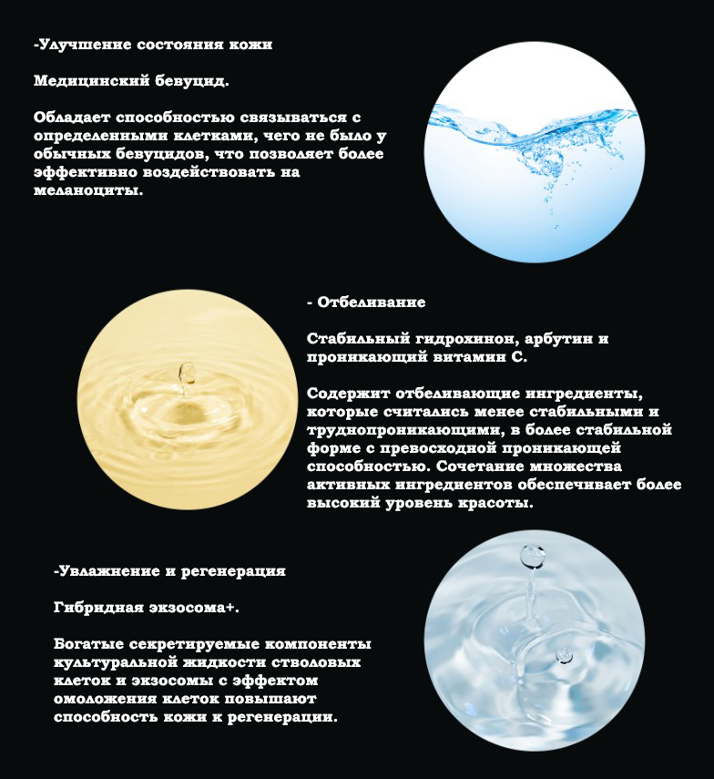 Состав: вода, глицерин, каприловый/каприновый триглицерил, BG, масло оливы, цетеариловый спирт, сквалан, бегениловый спирт, пентиленгликоль, масло пенника лугового, масло семян жожоба, (C14-22) спирт, мальтит, диметикон, глицерилстеарат, экстракт стволовых клеток человека, цетеарил глюкозид (полученный из пшеницы), феноксиэтанол, (C12-20) алкил глюкозид (полученный из пшеницы), димер дилинолевая кислота/стеариновая кислота/гидроксистеариновая кислота полиглицерил-10, ксантановая камедь, этилгексилглицерин, токоферол, EDTA-2Na, масло плодов шиповника, глицирризиновая кислота 2K, гидрогенизированный лецитин, масло цветов дамасской розы, 1,2-гександиол, полисорбат 80, гиалуронат натрия, пиросульфит натрия, каприлилгликоль, хлорид цеталкония, арбутин, ацетат токоферола, молочная кислота/гликолевая кислота сополимер, аскорбил глюкозид, нормализованная среда для культивирования стволовых клеток 9, пальмитоилоктапептид-27 амид, гидрохинон, поливиниловый спирт, экзосомы мезенхимальных клеток жировой ткани человека, пальмитоил синтетический человеческий трипептид-5 норисолеуцил синтетический человеческий нонапептид-1, гидроксид калия, экстракт семян коикса, аскорбиновая кислота, аскорбил метил карбонил пентапептид-72-три-трет-бутилтриптофанамид, этилцеллюлоза, пальмитоилдипептид-18, лаурет-4, стеариновая кислота.