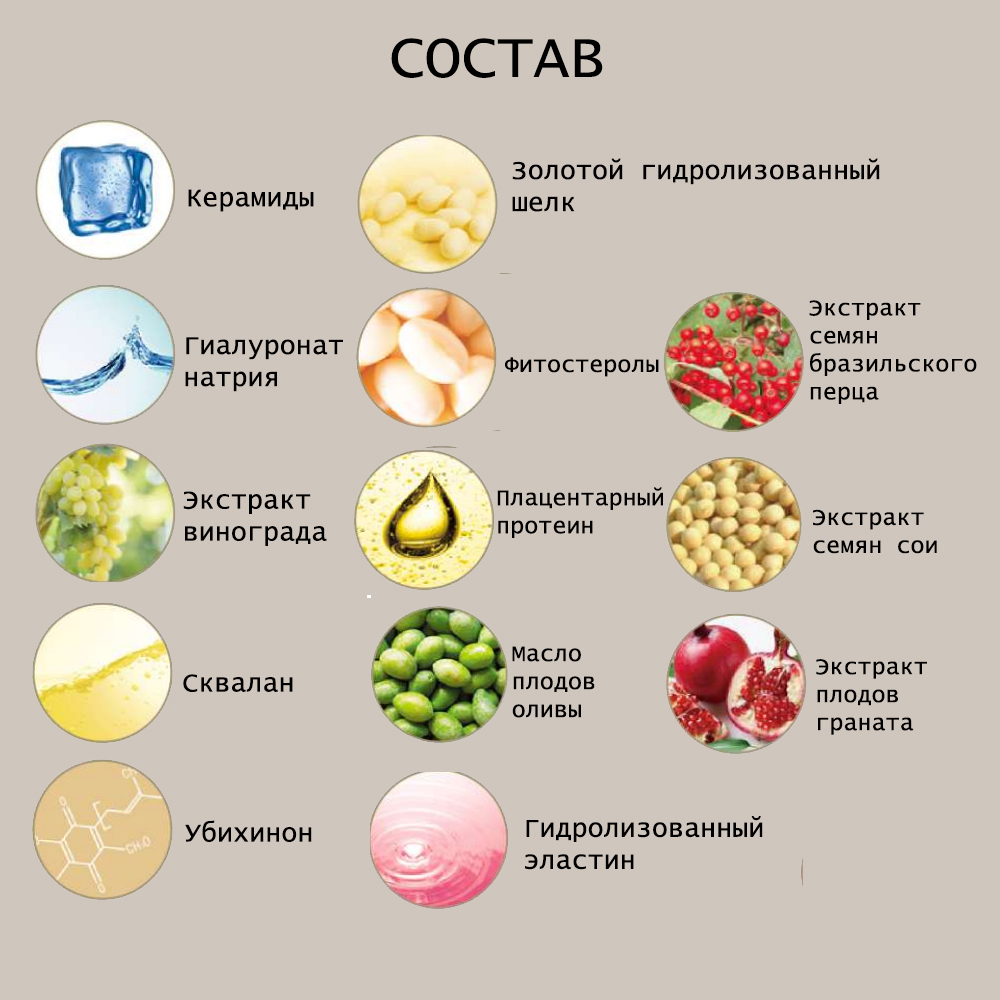 Состав: ПЕПТИДНЫЙ КОМПЛЕКС В НАНОКАПСУЛАХ (гептапептид пальмитат -15, пальмитоилгептапептид -14), гептапептид пальмитат -15, пальмитоилтетрапептид -50, экстракт цветов/листьев/стеблей мальвы, экстракт плодов цезальпинии), 4 вида керамидов (керамид EOP, керамид NG, керамид NP, керамид AP), фитостеролы, золотой (гидролизованный) шелк, EGF (рекомбинантный олигопептид-1), гидролизованный коллаген, гидролизованный эластин, гидролизованная гиалуроновая кислота, сквалан, масло плодов оливы, экстракт семян бразильского перца, убихинон, экстракт винограда, экстракт семян сои, экстракт плодов граната, плацентарный протеин.