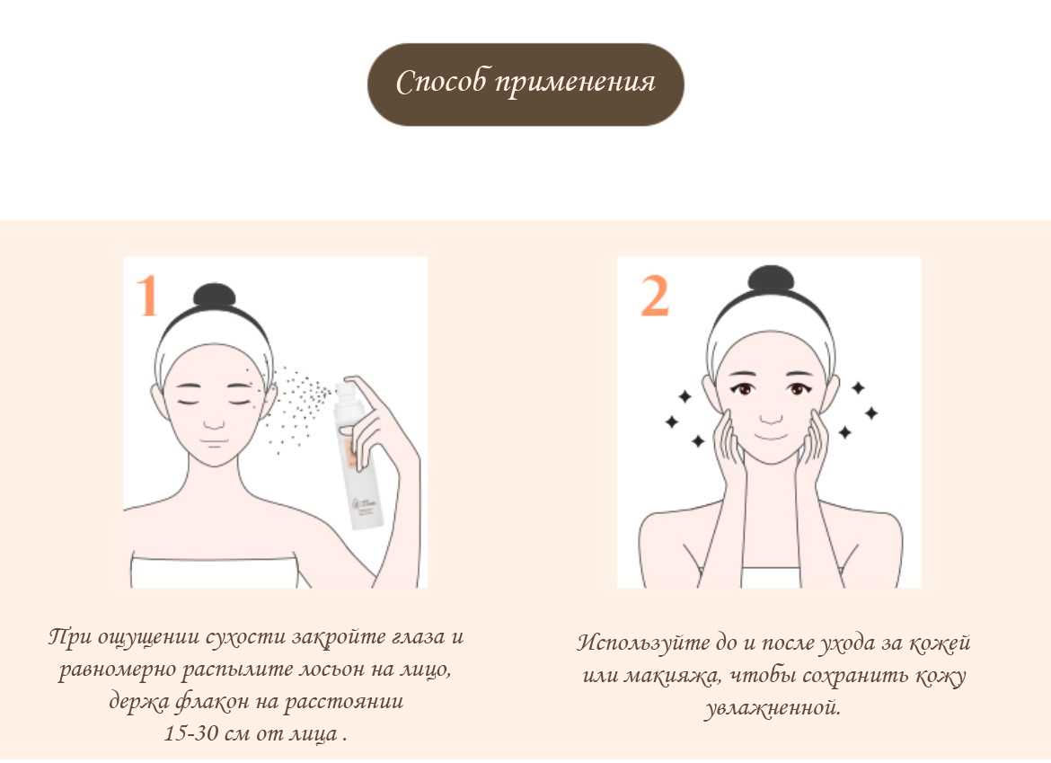 - Удобство использования: благодаря своей жидкой текстуре и легкому приятному запаху, лосьон-спрей легко распыляется на лицо. Вы можете взять его с собой в дорогу, в офис, на отдых или даже в самолет.