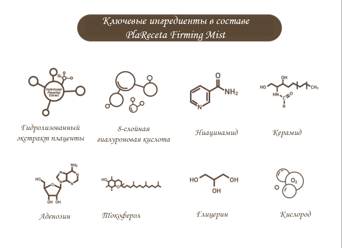 - Богатый состав: спрей содержит гидролизат плаценты животного происхождения, ниацинамид (витамин B3), восьмислойную гиалуроновую кислоту, аденозин и керамиды. Эти активные ингредиенты работают синергично, улучшая состояние кожи, стимулируя процесс регенерации и борясь с признаками старения. Керамиды также создают барьер против бактерий и загрязнений, сохраняя влагу в коже.
