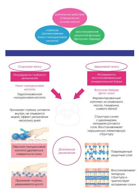 Содержащаяся в маске гиалуроновая кислота в сочетании с растительными экстрактами обеспечивает интенсивное увлажнение кожи, сохраняя её увлажненность на протяжении длительного времени и придавая ей здоровый вид и сияние.
