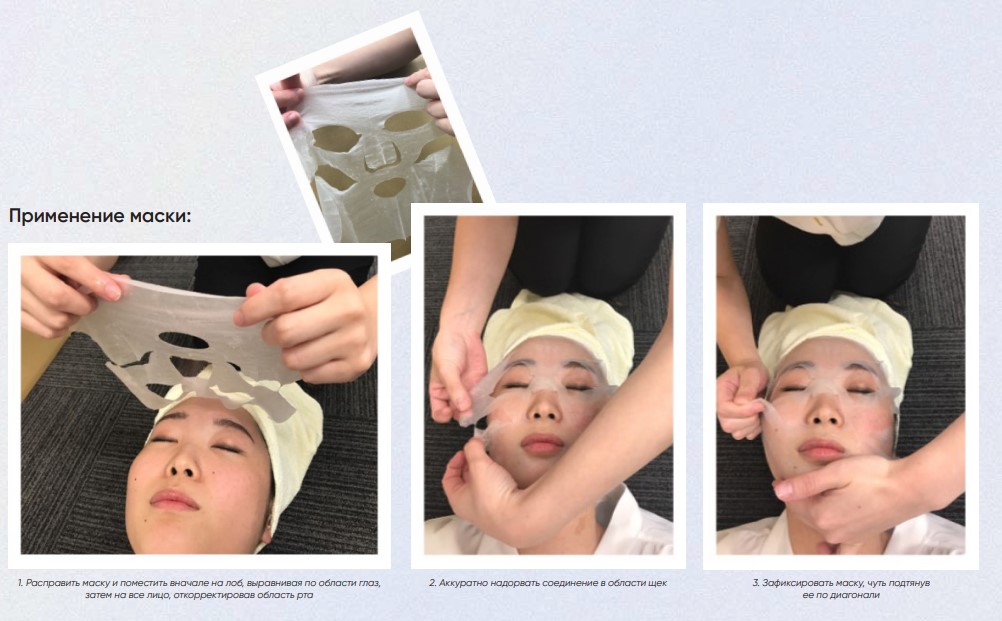 Способ применения: Извлечь маску из упаковки и распределить по лицу так, чтобы она плотно прилегала к коже (надрезать или надорвать соединяющую часть в области щек). Оставить на 10–15 минут. Остатки маски впитать в кожу. Применять 2–3 раза в неделю. При повышенной сухости и нарушении барьерной функции использовать 3 дня подряд, затем 1 раз в неделю.