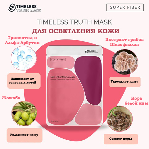 Линия масок Super Fiber, в которую входит осветляющая маска для кожи Timeless Truth Skin Enlightening Mask, производится по эксклюзивной технологии из Японии, способствующей максимальному впитыванию питательных веществ глубоко в кожу. Экстракт грибного мицелия, использованный в этой маске, укрепляет защитные способности кожи, предотвращает окисление, борется с морщинами, эффективно увлажняет и разглаживает кожу, делая ее здоровой и отдохнувшей.