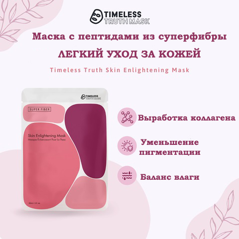 Осветляющая маска для кожи Timeless Truth Skin Enlightening Mask обеспечивает не только воздействие на сам пигмент, но и мягкое обновление и укрепление кожи. Ее формула включает грибной мицелий, пептидный комплекс, гиалуроновую кислоту, экстракт ивы, ниацинамид и арбутин, которые в сочетании обеспечивают увлажнение, успокаивающее действие, укрепление иммунитета кожи, антиоксидантную поддержку и уменьшение признаков пигментации.