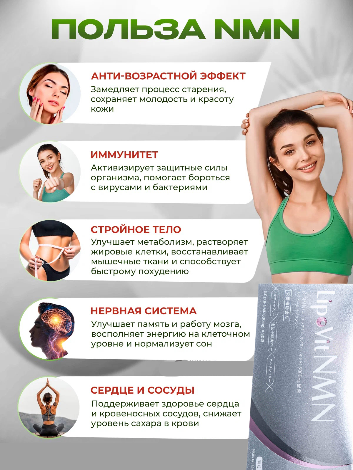 С годами уровень NMN в организме естественно уменьшается, что приводит к ускорению процессов старения и увеличивает вероятность возникновения возрастных патологий. LipoVit NMN помогает замедлить эти процессы и снизить риск развития ишемических сердечных недугов, деменции, а также других хронических заболеваний, связанных с возрастом.