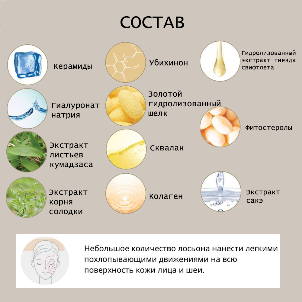 Состав: ПЕПТИДНЫЙ КОМПЛЕКС В НАНОКАПСУЛАХ (гептапептид пальмитат -15, пальмитоилгептапептид -14, гептапептид пальмитат -15, пальмитоилтетрапептид -50, экстракт цветов/листьев/стеблей мальвы, экстракт плодов цезальпинии), экстракт саке, гидролизованный шелк, гидролизованный экстракт гнезда свифтлета, гиалуронат натрия, коллаген, керамиды, фитостеролы, экстракт листьев кумадзаса, EGF, сквалан, фитостерил жирных кислот ореха макадамия, убихинон, экстракт корня солодки.