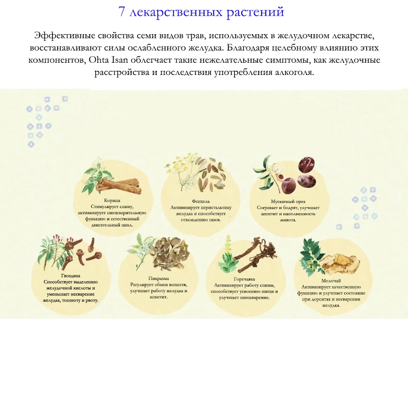 а также при нарушениях пищеварения, включая плохой аппетит и повышенный желудочно-кислотный баланс. "Ohta Isan" также оказывает помощь при тошноте, вызванной различными причинами, включая похмелье, и симптомах, таких как рвота и отрыжка.