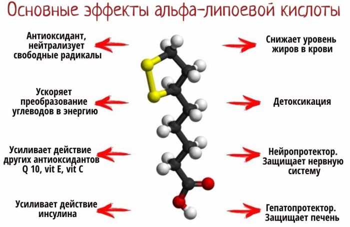 - Альфа-липоевая кислота. Ускоряет преобразование углеводов в энергию, уменьшает высокий уровень сахара в крови, выводит токсины и способствует восстановлению клеток печени. Имеет мощное антиоксидантное действие, стимулирует биологическое омоложение.