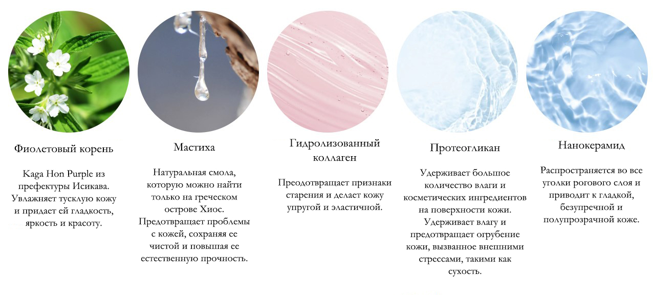Состав: Вода, BG, глицерин, пентиленгликоль, глицирризиновая кислота 2К, экстракт корня мурасаки, гидролизованный коллаген, церамид NP, мастиковая смола, водорастворимые протеогликаны, бетаин, гликозилтрегалоза, гидролизованный крахмал, Aureobasidium pullulans/рисово-ореховый фермент, Гидрогенизированный лецитин, полисахарид Cladosiphonobae caledoniae, токоферол, лауроил глутамат ди (фитостерил/октилдодецил), экстракт культуры сфингомонады, ксантановая камедь, лимонная кислота, цитрат натрия, феноксиэтанол.