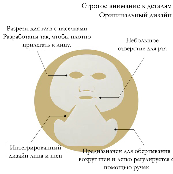 Маска обладает уникальной конструкцией, которая обеспечивает плотное прилегание к коже, покрывая её от лица до шеи. Каждый лист маски пропитан 35 мл сыворотки – это эквивалент одной полноценной бутылки, обеспечивая вашей коже чувство сытости и упругости.