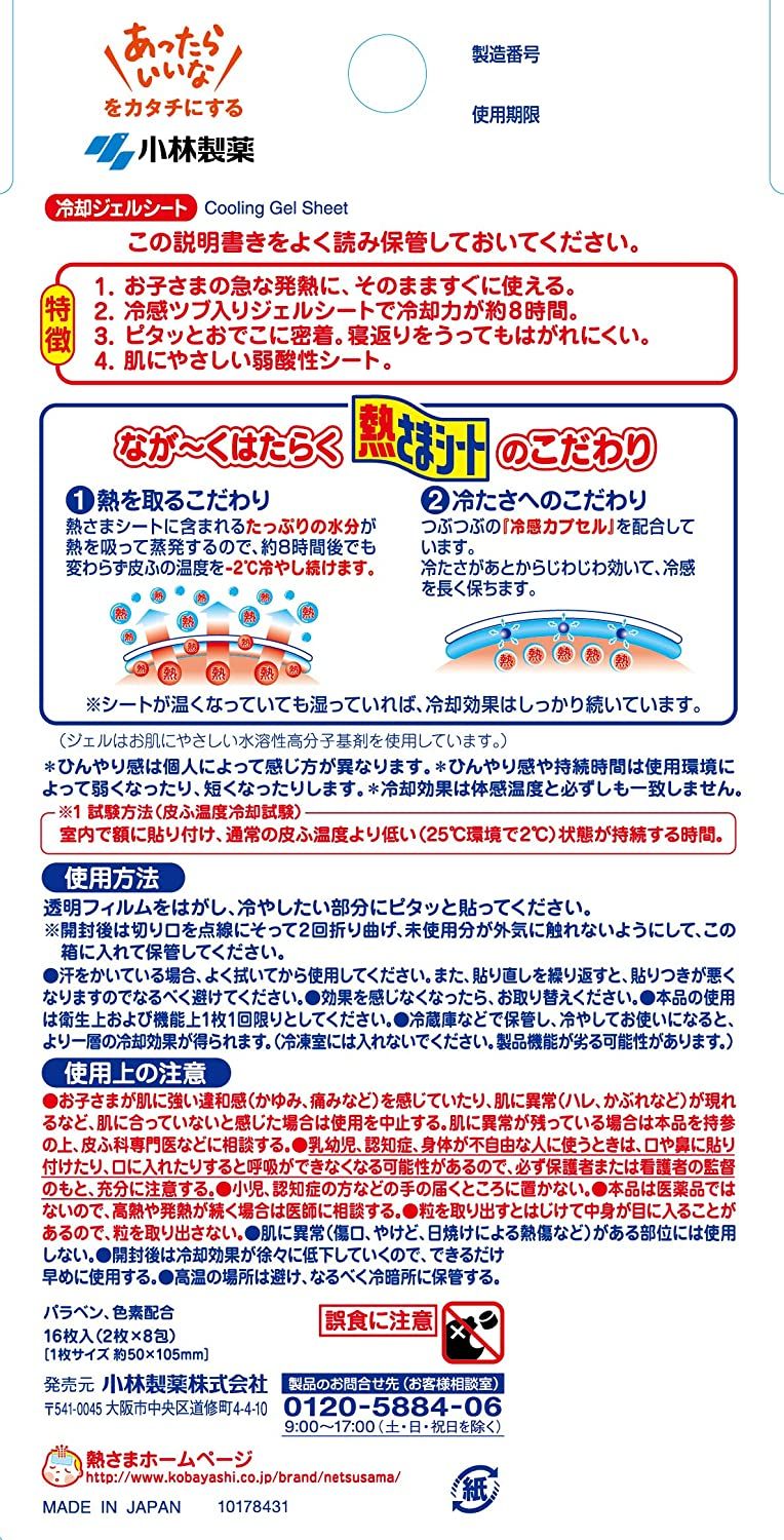 Пластырь Kobayashi Cooling Gel Sheet снижает даже высокую температуру до -2 градусов при однократном использовании. Его можно применять сразу при внезапной лихорадке у детей. В одной упаковке 16 штук. Пластырь крепят на теле малыша в тех зонах, где наиболее ощутимо контролируется температура тела: